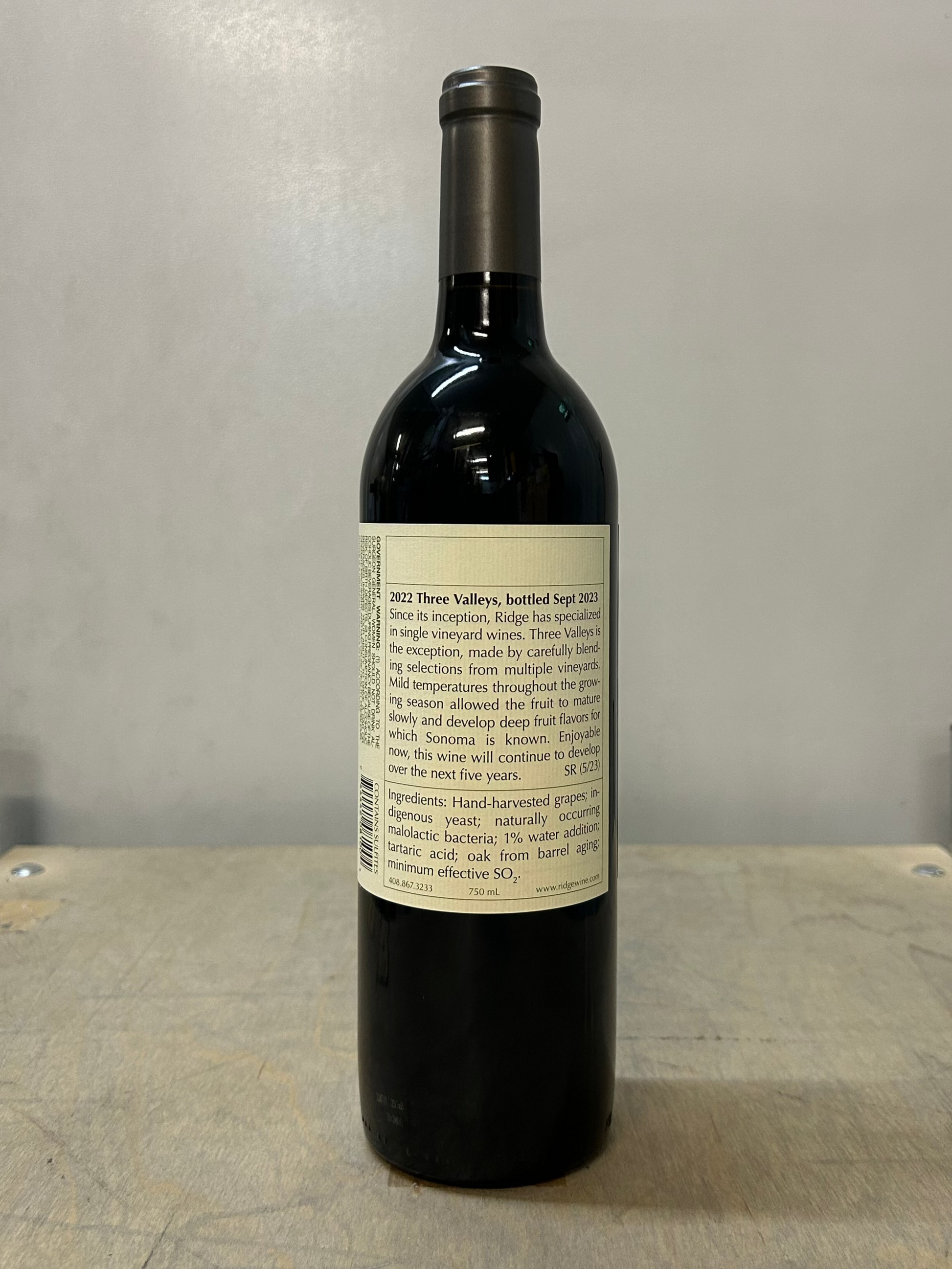 Since its inception, Ridge has specialized in single vineyard wines. Three Valleys is the exception, made by carefully blending selections from multiple vineyards. Mild temperatures throughout the growing season allowed the fruit to mature slowly and develop deep fruit flavors for which Sonoma is known. Enjoyable now, this wine will continue to develop over the next five years.